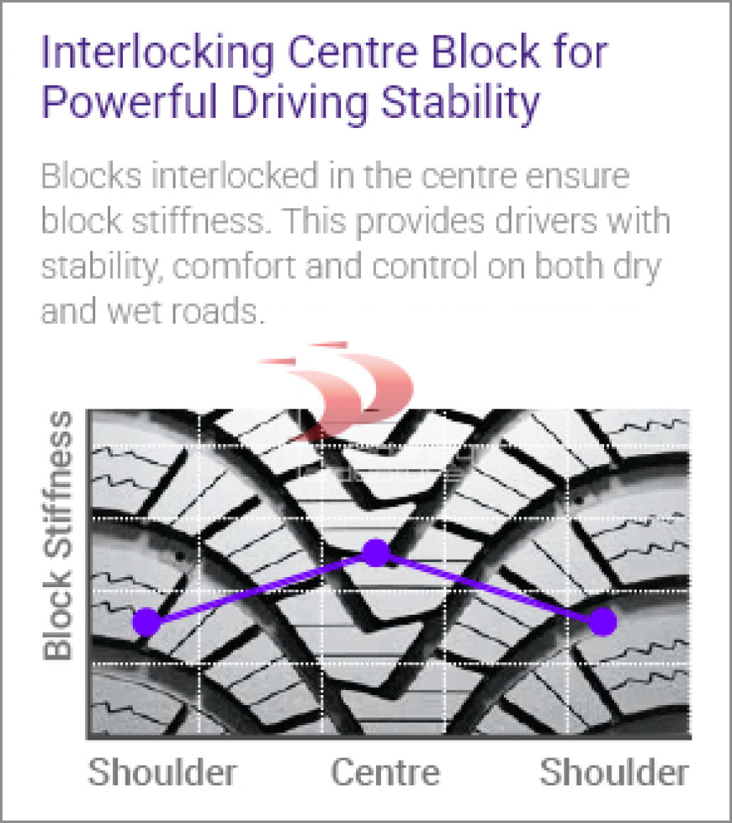 Centriniai padangos blokai yra tarpusavyje susijungę, tai padeda užtikrinti padangos standumą ir tvirtą struktūrą. Dėl to vairuotojas gali mėgautis puikiu automobilio stabilumu, komfortu ir valdymo kontrole tiek sausoje, tiek šlapioje kelio dangoje. Idealiai tinka tiems, kurie vertina saugumą ir tikslų valdymą įvairiomis sąlygomis.