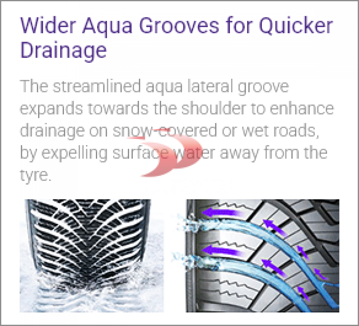 Centriniai padangos blokai yra tarpusavyje susijungę, tai padeda užtikrinti padangos standumą ir tvirtą struktūrą. Dėl to vairuotojas gali mėgautis puikiu automobilio stabilumu, komfortu ir valdymo kontrole tiek sausoje, tiek šlapioje kelio dangoje. Idealiai tinka tiems, kurie vertina saugumą ir tikslų valdymą įvairiomis sąlygomis.