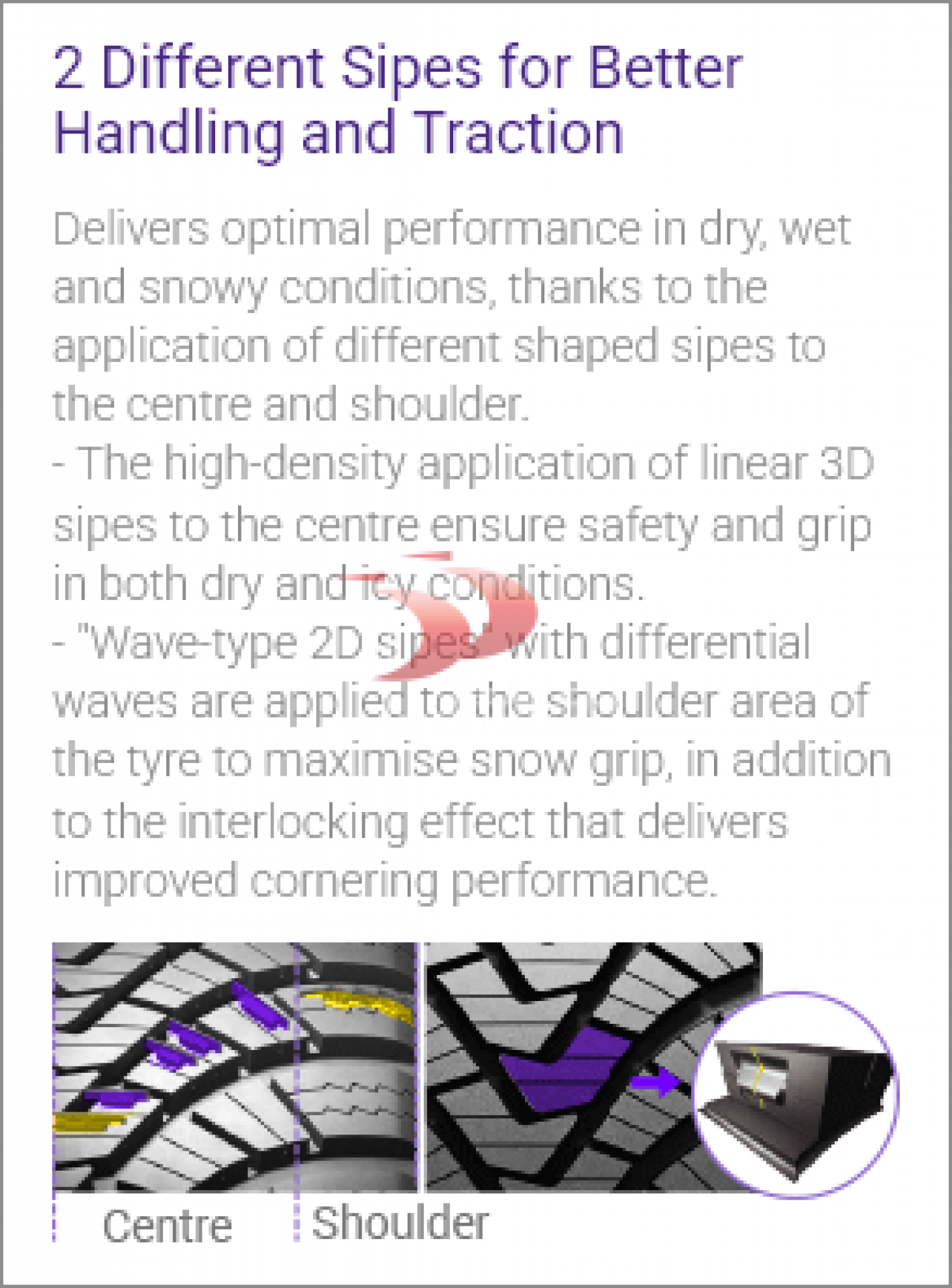 Padangoje panaudotos skirtingos formos lamelės užtikrina puikų našumą sausoje, šlapioje ir snieguotoje kelio dangoje. Didelio tankio 3D lamelės centre suteikia saugumą ir sukibimą tiek sausoje, tiek apledėjusioje kelio dalyje. Banguotos 2D lamelės maksimaliai gerina sukibimą su sniegu ir sustiprina tarpusavio blokų sąveiką, pagerindamos stabilumą posūkiuose.