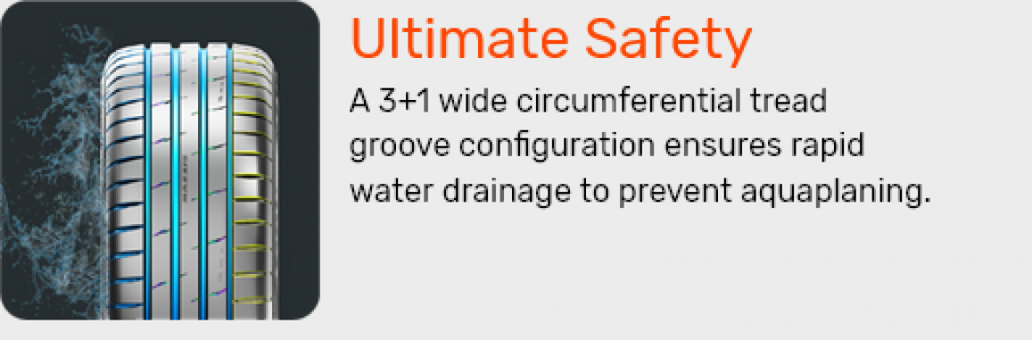 3+1 pločio išilginių protektoriaus griovelių konfigūracija užtikrina itin greitą vandens pašalinimą nuo padangos kontakto zonos. Tai efektyviai sumažina akvaplanavimo riziką ir padeda išlaikyti stabilų sukibimą net ir važiuojant šlapia ar slidžia kelio danga. Optimizuota protektoriaus struktūra leidžia vandeniui greitai pasišalinti, taip užtikrinant didesnį saugumą, geresnį valdymą ir didesnį pasitikėjimą vairuojant sudėtingomis oro sąlygomis.